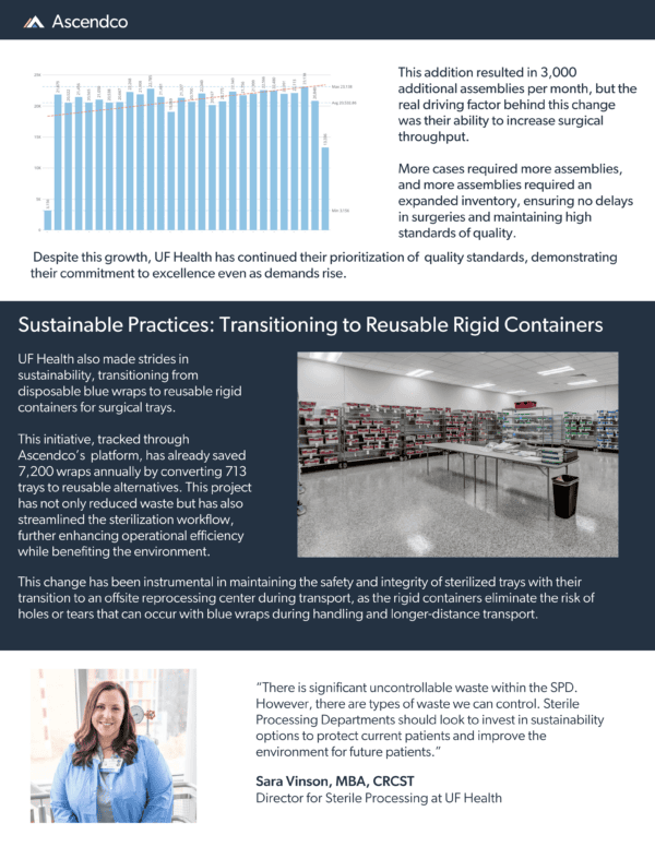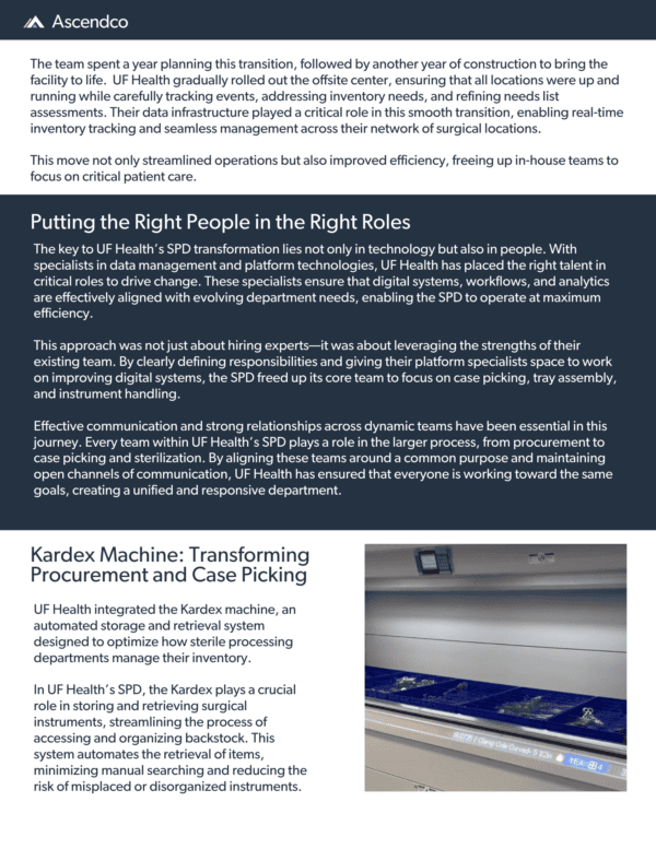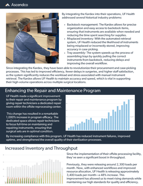 Ascendco Health partners with thousands of sterile processing departments nationwide to enhance workflows, optimize inventory management, and prioritize patient safety. By sharing success stories like UF Health Shands’, Ascendco Health aims to illustrate the transformative power of innovation within the often-siloed field of sterile processing. UF Health Shands’ commitment to real-time analytics, cutting-edge technology, and cohesive teamwork exemplifies what’s possible when sterile processing is driven by a mission of excellence.