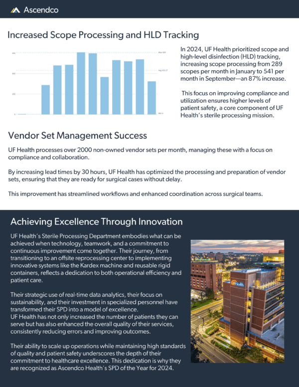 Chicago, IL – October 28, 2024 – Ascendco Health is thrilled to announce UF Health Shands as the recipient of the 2024 Sterile Processing Department of the Year award, acknowledging their outstanding achievements in sterile processing through advanced technology, data-driven strategies, and a firm commitment to patient safety. This inaugural award celebrates health systems that demonstrate exceptional standards in sterile processing, setting benchmarks for quality, efficiency, and sustainability.